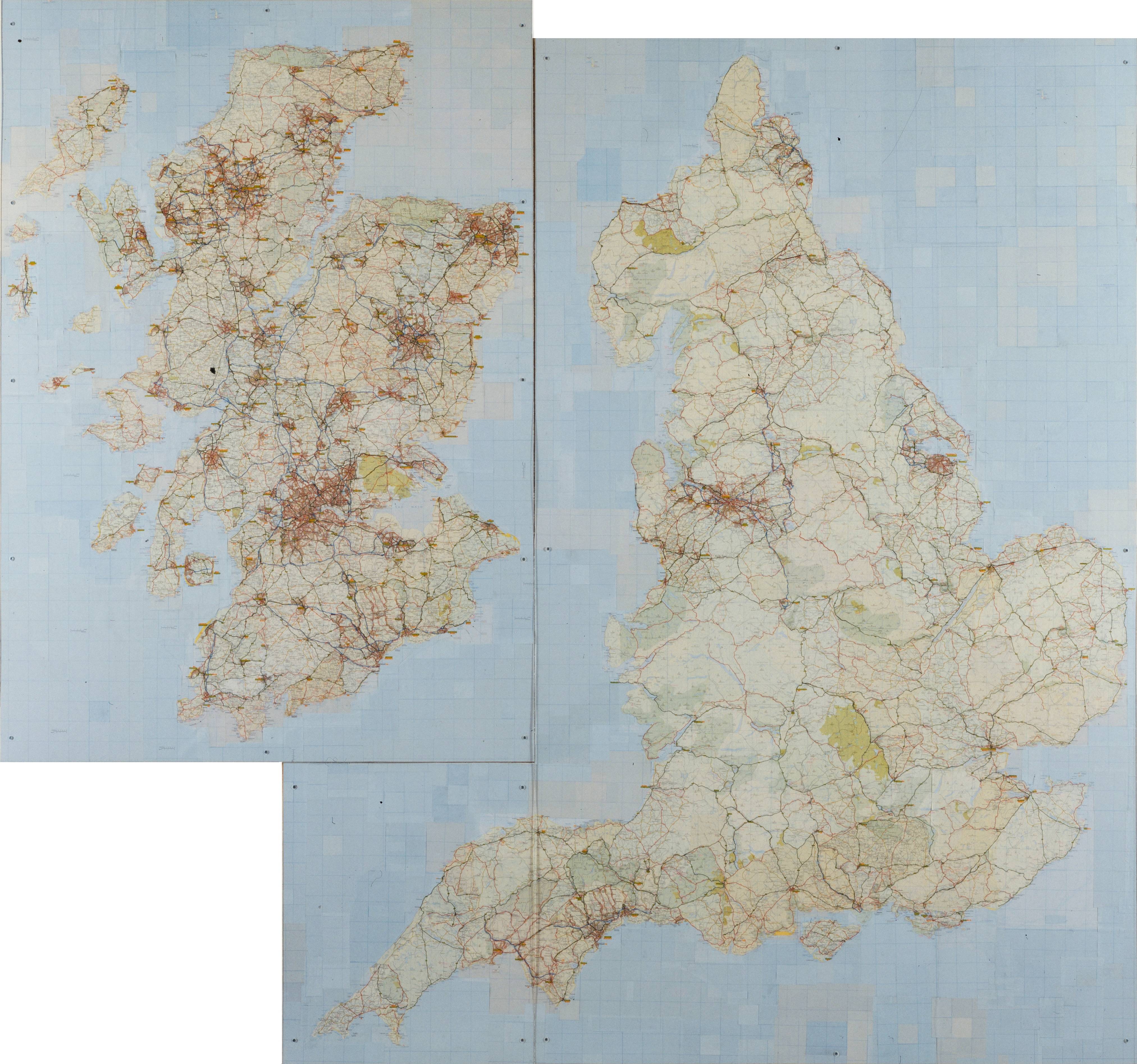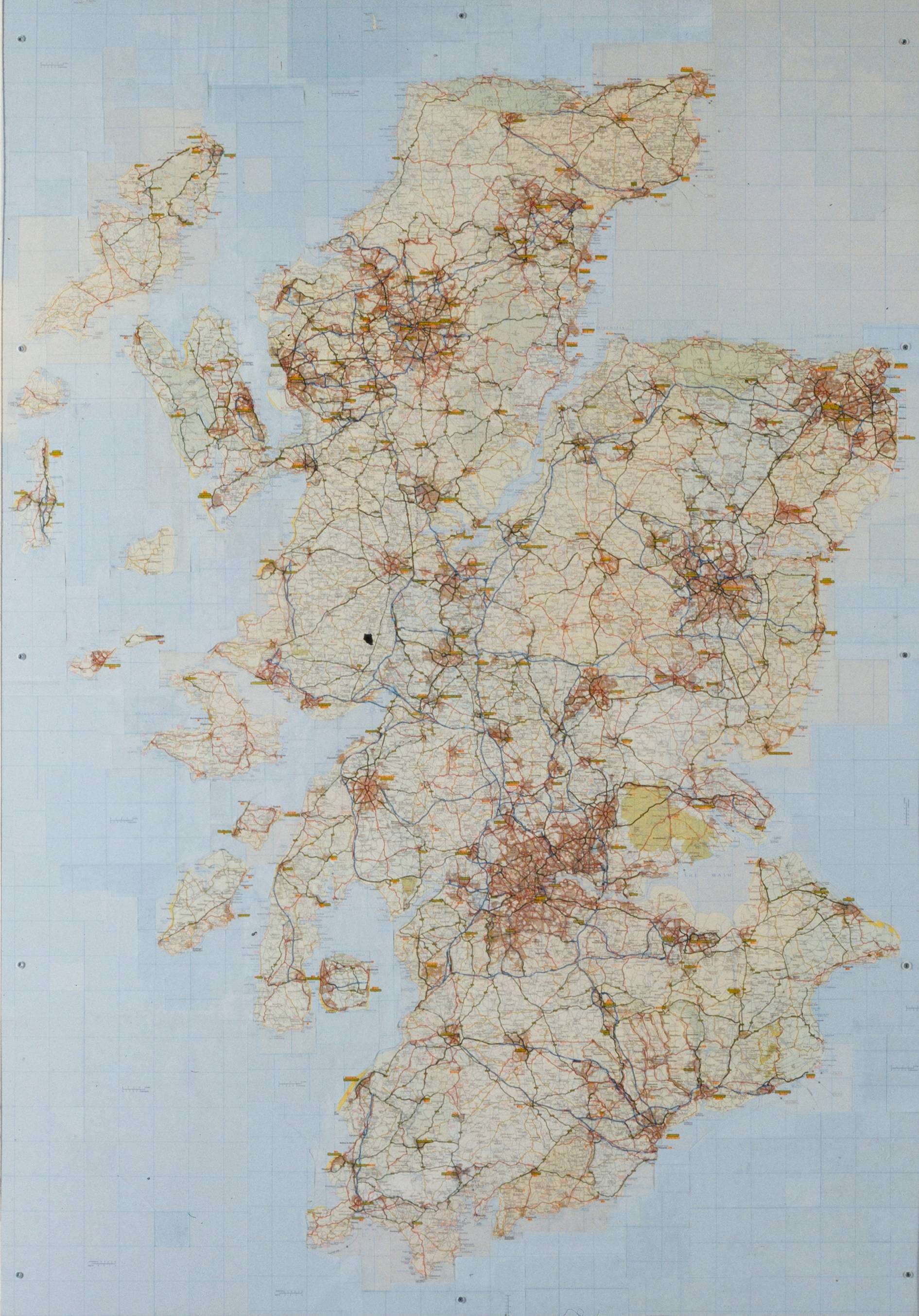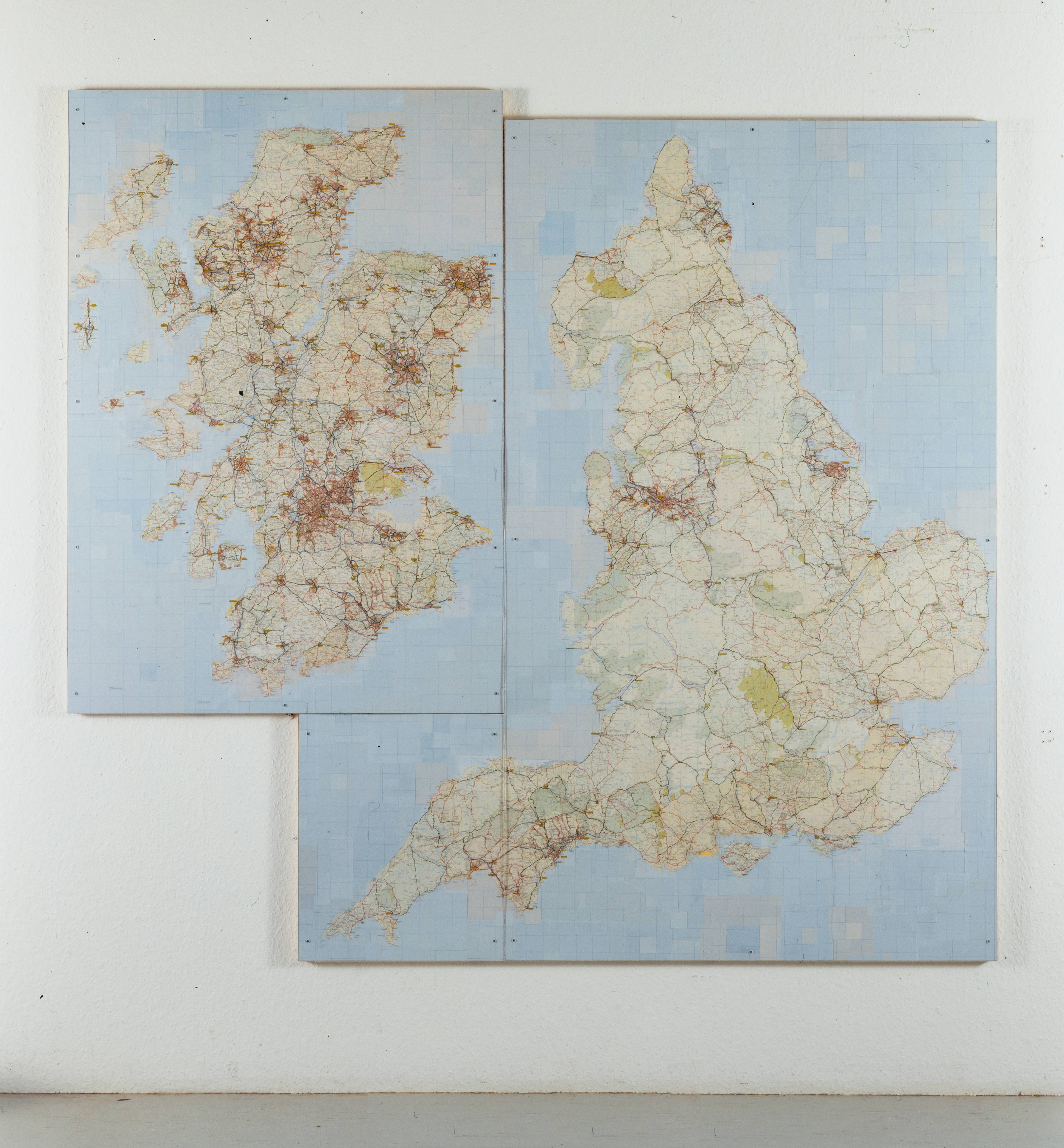 United Kingdom is a large collage presenting an altered version of the road map of the United Kingdom. It is created from fragments of maps, cut from commercially produced UK road atlases, and re-arranged to create a work that is plausible, at first glance, as a genuine map. The collage has been carefully designed, so that roads appear continuous and navigable, conferring authority on the map. Yet on further investigation, the artist's disorientating manipulation of the map is revealed; Scotland and England are presented as separate islands, with Scotland occupying the position usually held by Ireland. Road systems are exchanged so that Scottish, Northern Irish and Welsh roads, cities and towns are redistributed within the English border. English, Northern Irish and Welsh territory appear within the Scottish landmass. Through this transformation, formerly coastal towns become landlocked, cities far from the sea become coastal destinations, densely populated cities occupy once rural highlands, and some names designate more than one location.