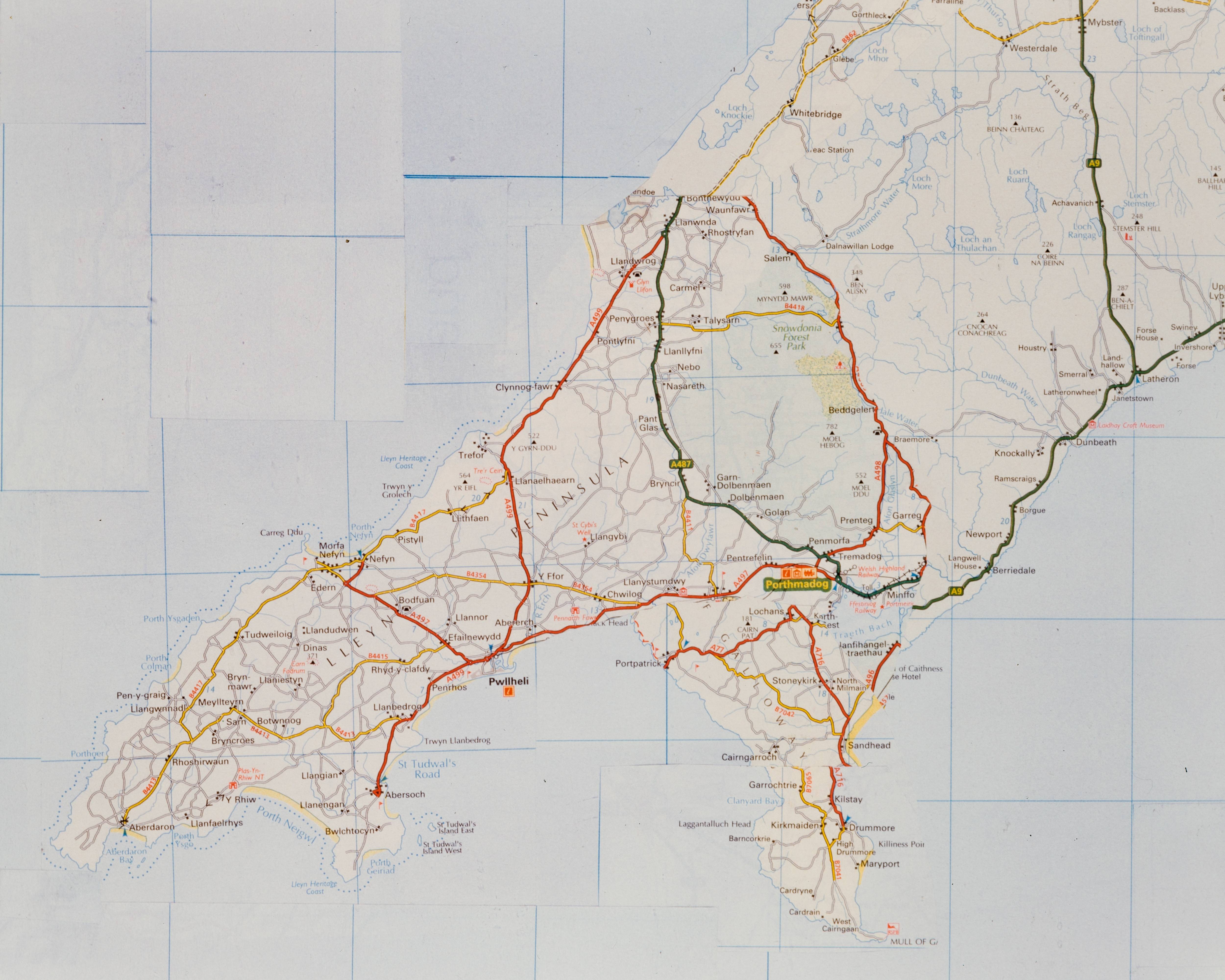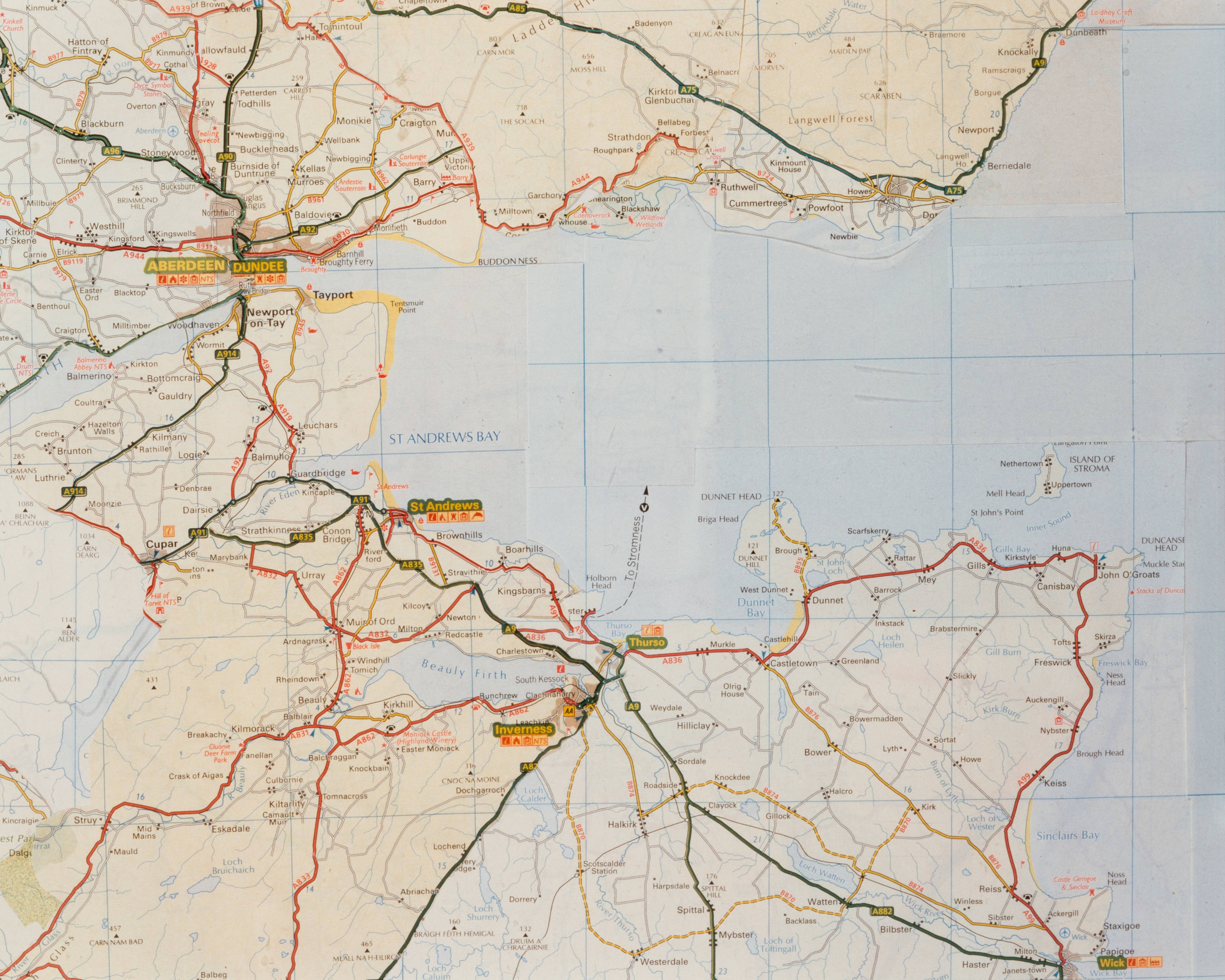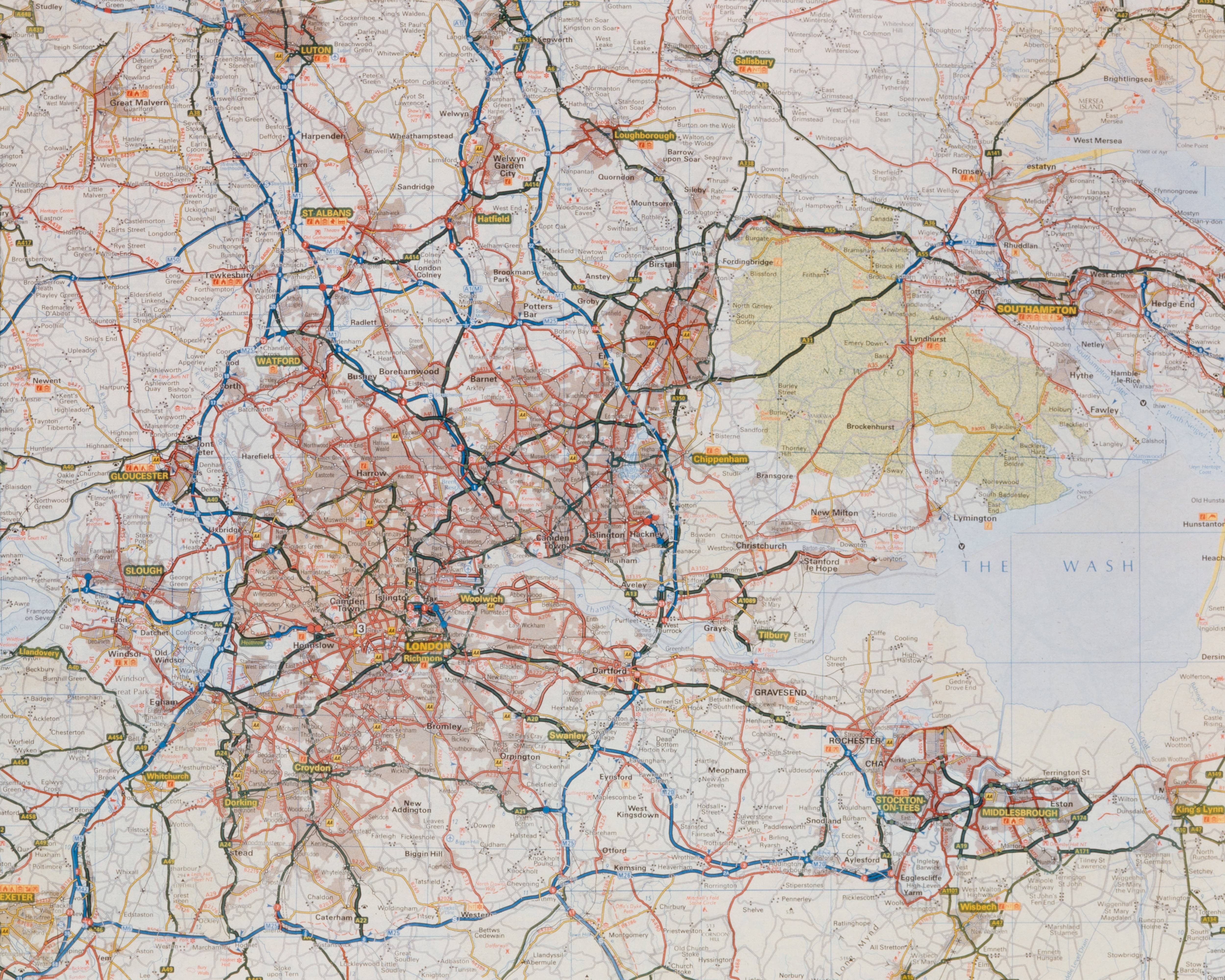 United Kingdom is a large collage presenting an altered version of the road map of the United Kingdom. It is created from fragments of maps, cut from commercially produced UK road atlases, and re-arranged to create a work that is plausible, at first glance, as a genuine map. The collage has been carefully designed, so that roads appear continuous and navigable, conferring authority on the map. Yet on further investigation, the artist's disorientating manipulation of the map is revealed; Scotland and England are presented as separate islands, with Scotland occupying the position usually held by Ireland. Road systems are exchanged so that Scottish, Northern Irish and Welsh roads, cities and towns are redistributed within the English border. English, Northern Irish and Welsh territory appear within the Scottish landmass. Through this transformation, formerly coastal towns become landlocked, cities far from the sea become coastal destinations, densely populated cities occupy once rural highlands, and some names designate more than one location.