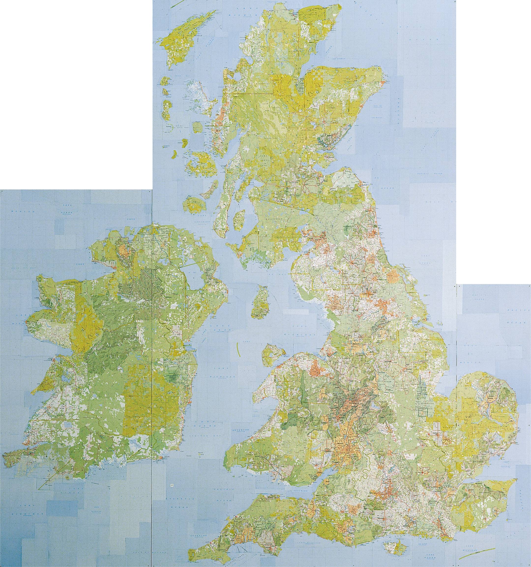 United Kingdom of America is a collage constructed from sections of USA topographical maps, cut from commercially available atlases, and re-arranged to create a map of Europe. The USA towns and cities included in the collage are mapped where their UK namesakes would usually be found.