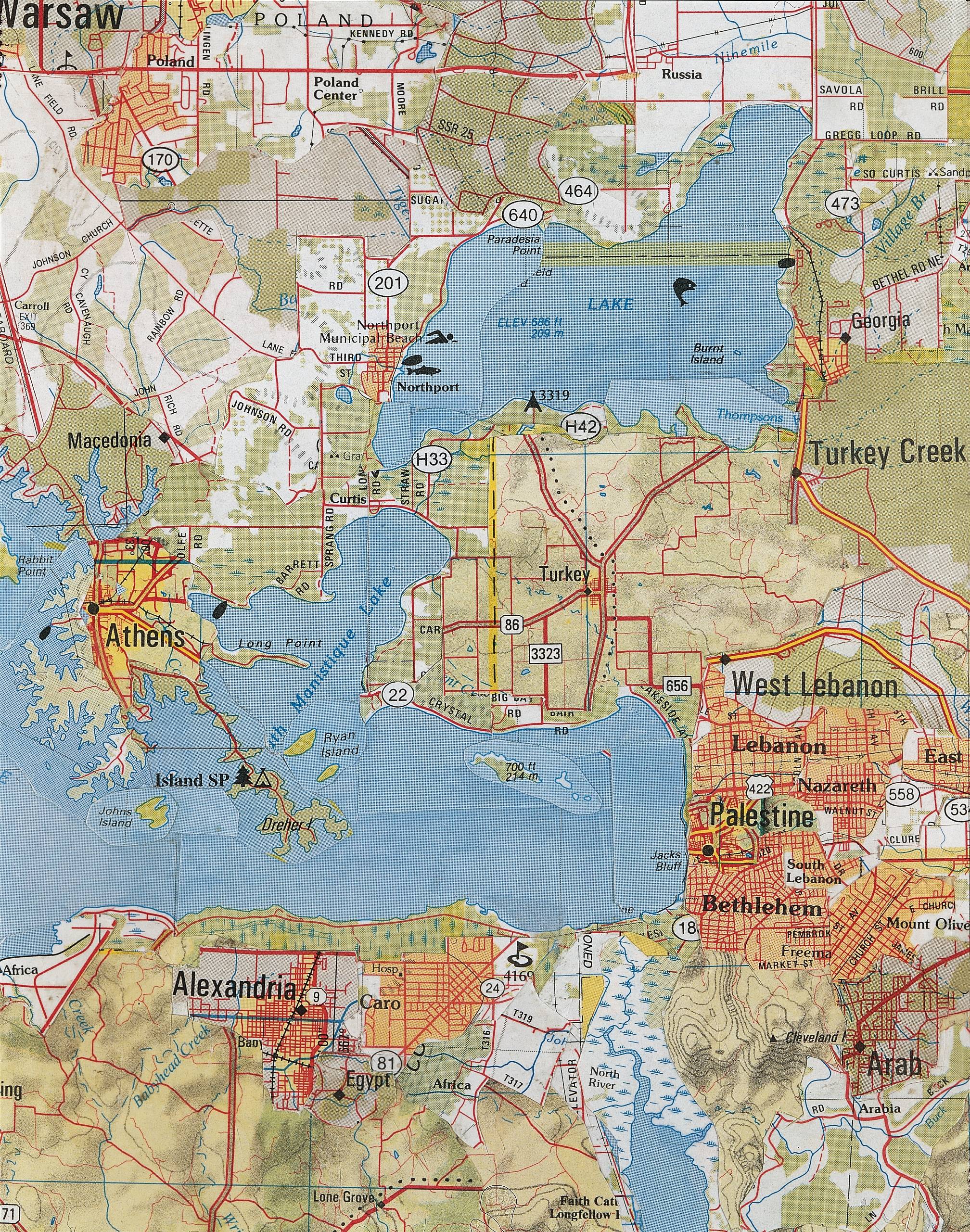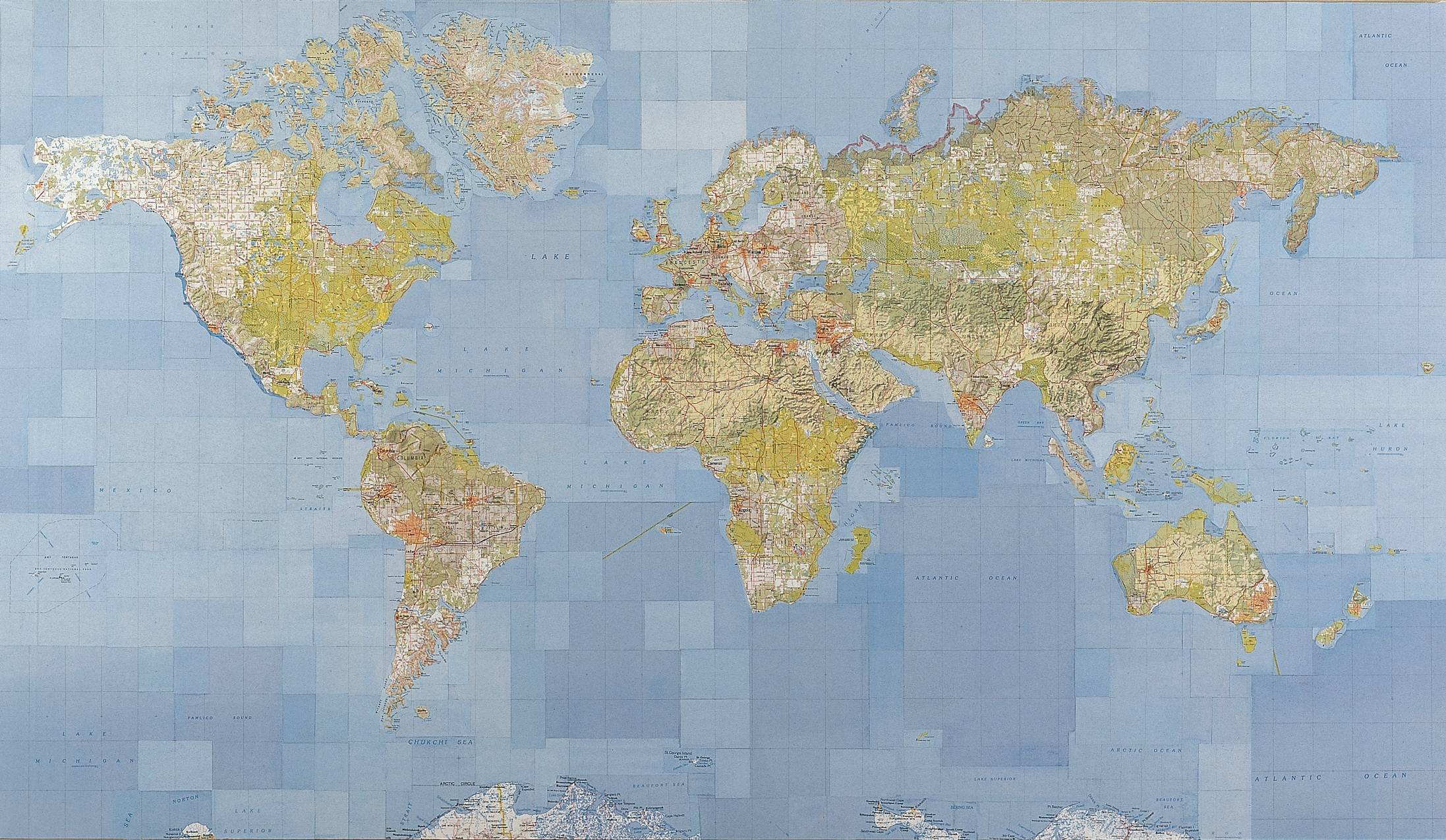 World State is a collage constructed from sections of USA topographical maps, cut from commercially available atlases, and re-arranged to create a world map. The USA towns and cities included in the collage are mapped where their namesakes would usually be found.