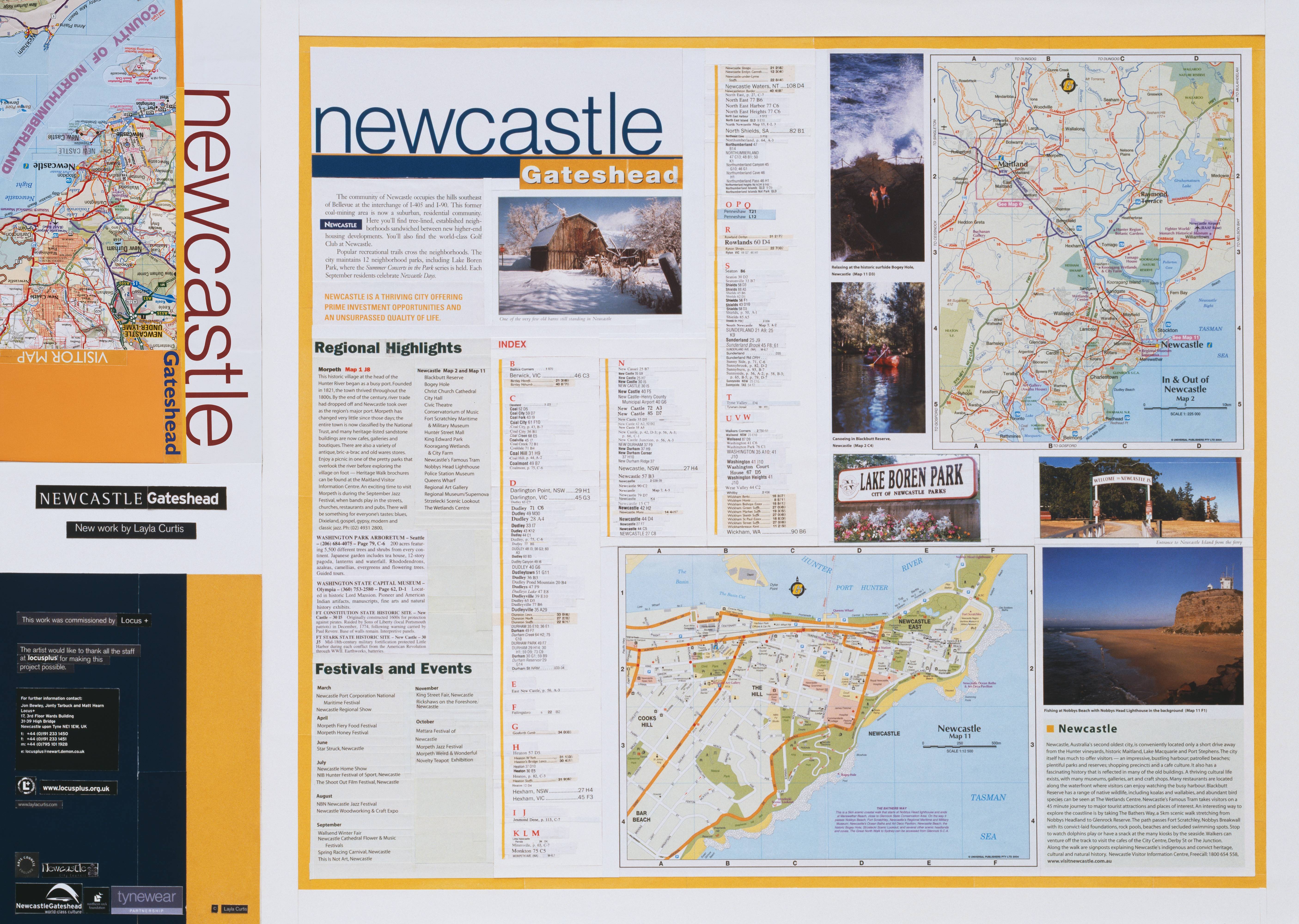 NewcastleGateshead is a diptych comprising a collaged map and a corresponding collaged index. The map, which takes the form of North East England, is compiled from regional namesakes cut from city maps worldwide. It includes towns, cities, rivers and other place names predominantly from the USA, Australia, Canada, Jamaica and Ireland. The collaged index accompanying the map lists all of the namesakes included in the map and is constructed from tiny fragments of international city maps.