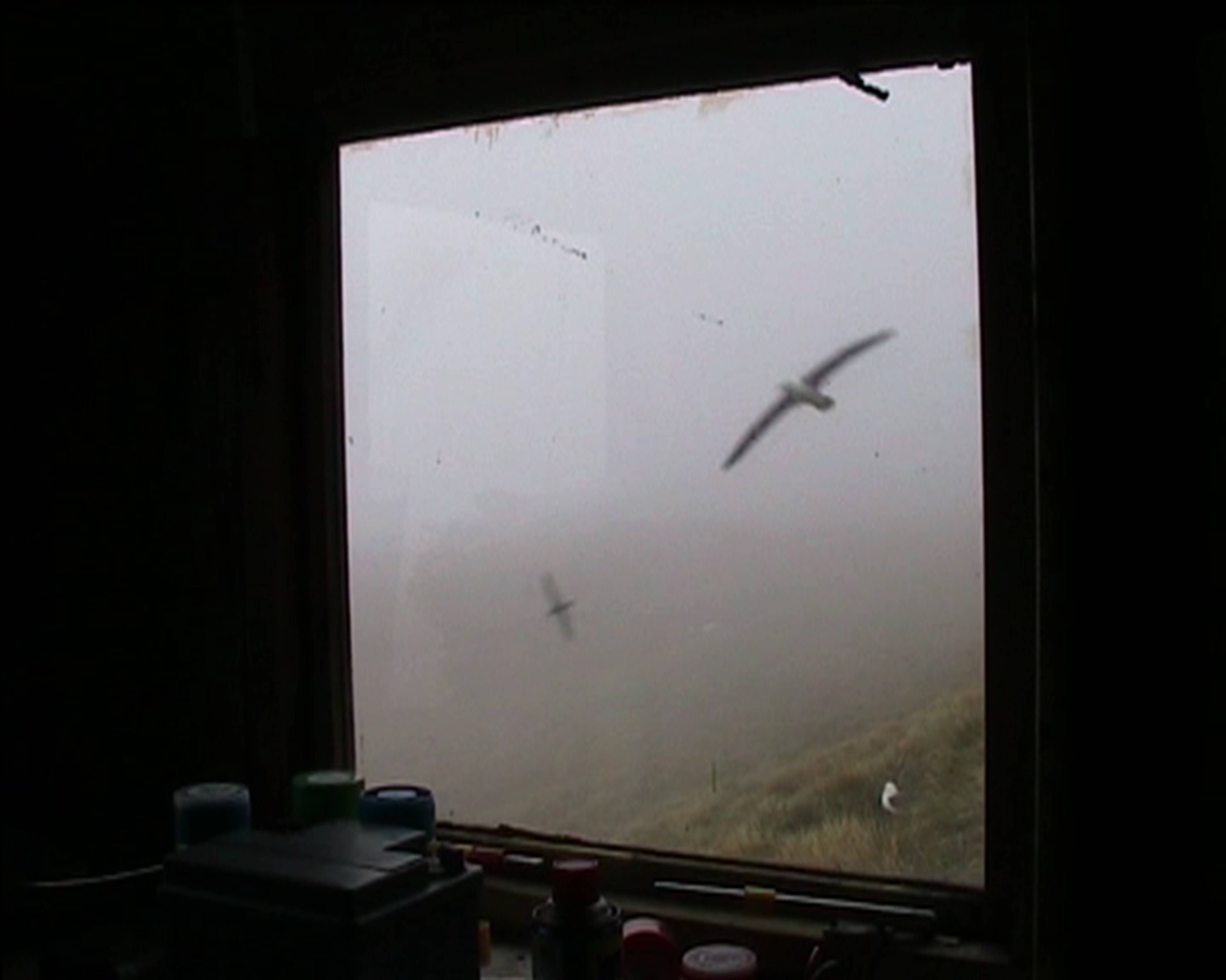 The artist travelled to the island on the RRS Ernest Shackleton during her journey to Antarctica with the British Antarctic Survey where she spent four days exploring as part of her interactive online work Polar Wandering. As part of her research, she accompanied a zoologist on their daily hike over steep tussock-grass-covered hills to one of the island's remote field huts to monitor an albatross colony. Wanderers was filmed out of the window of the hut and depicts hundreds of albatrosses making short appearances one at a time out of the damp misty sky.