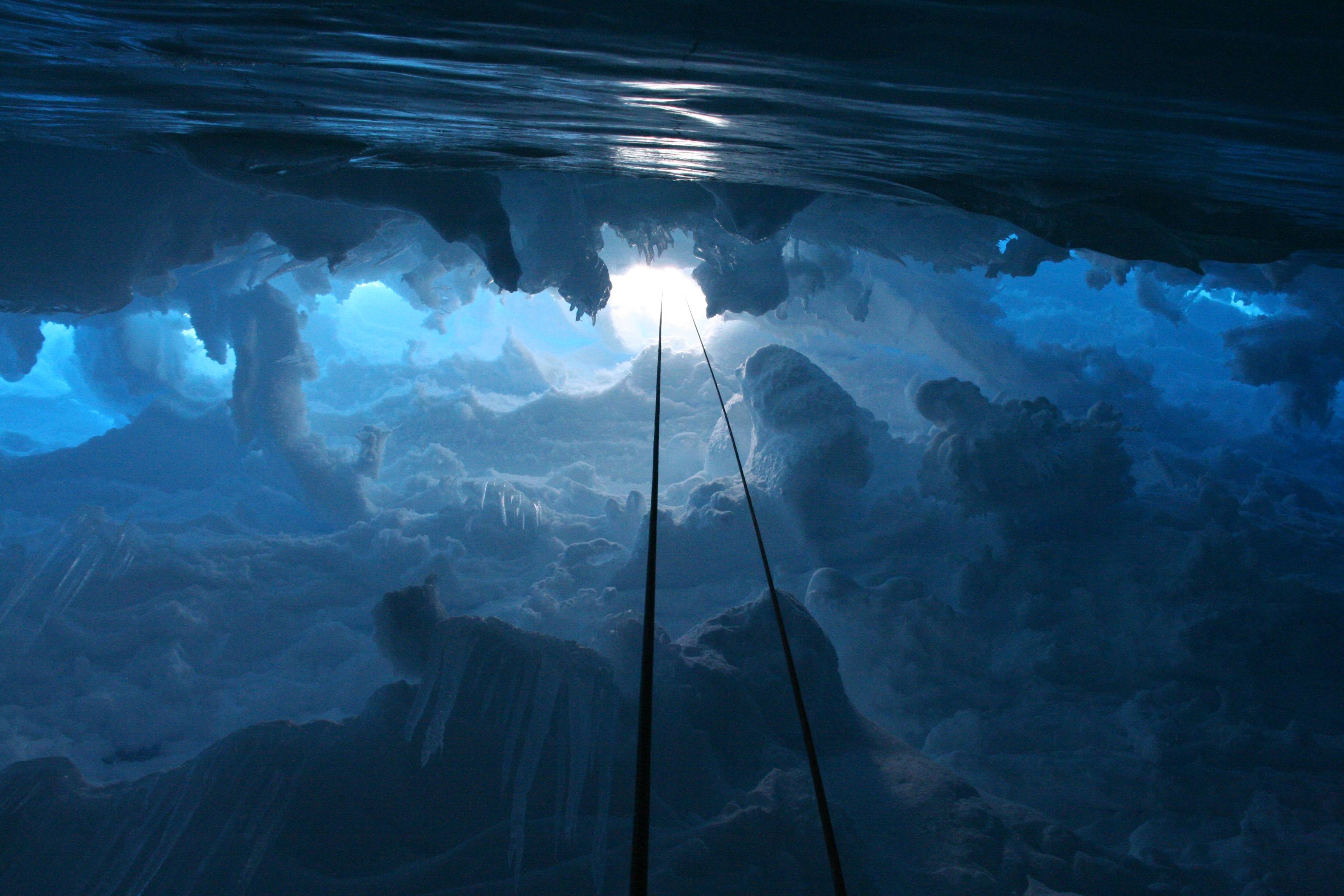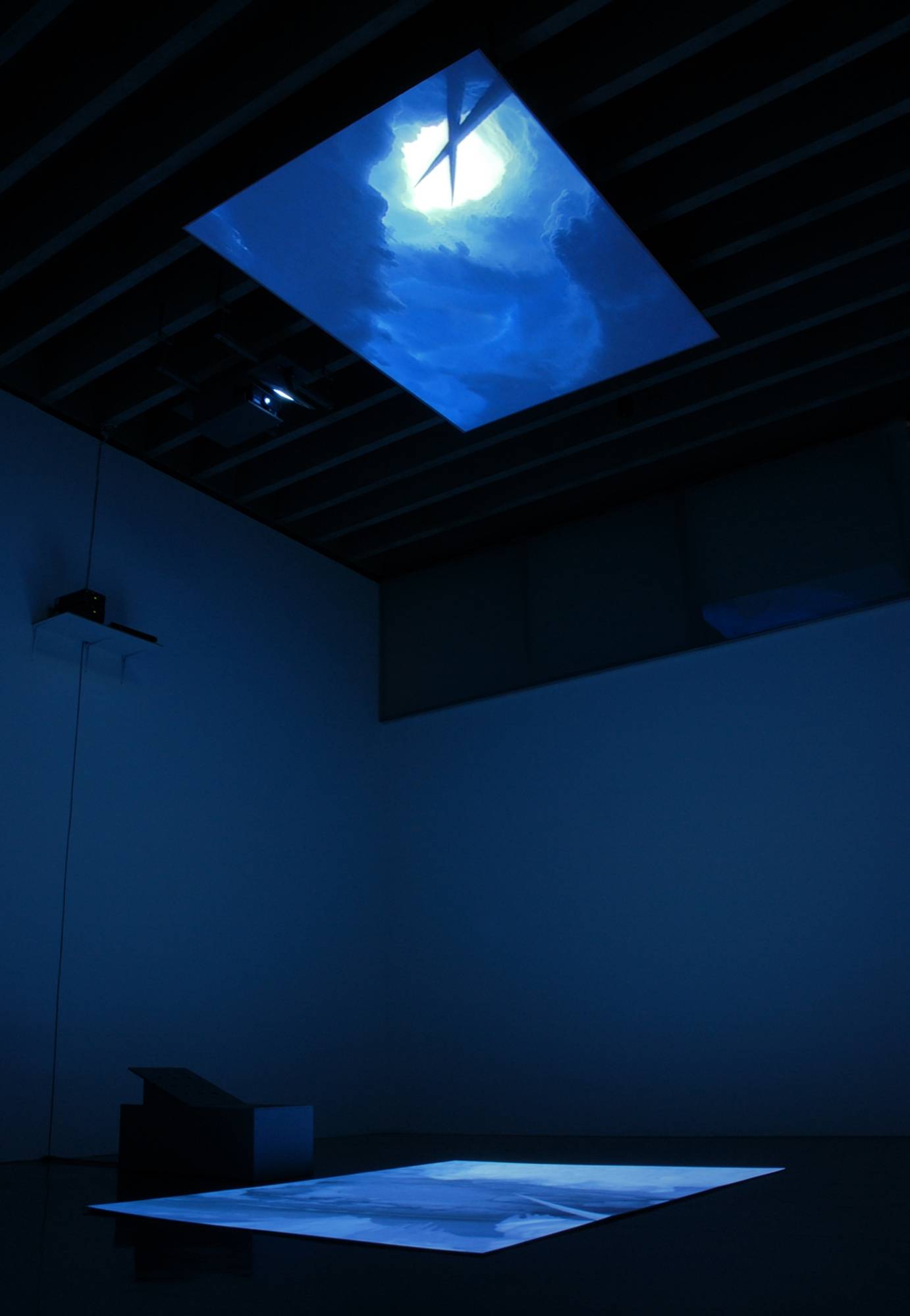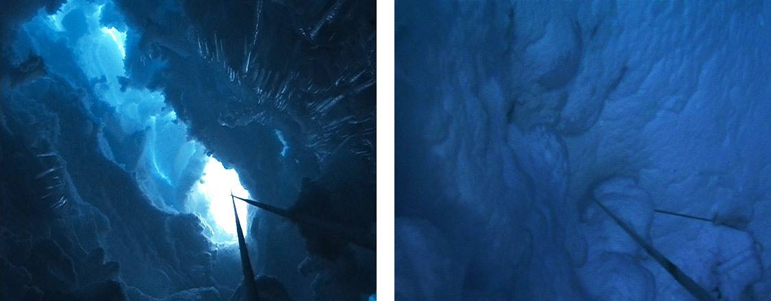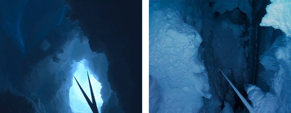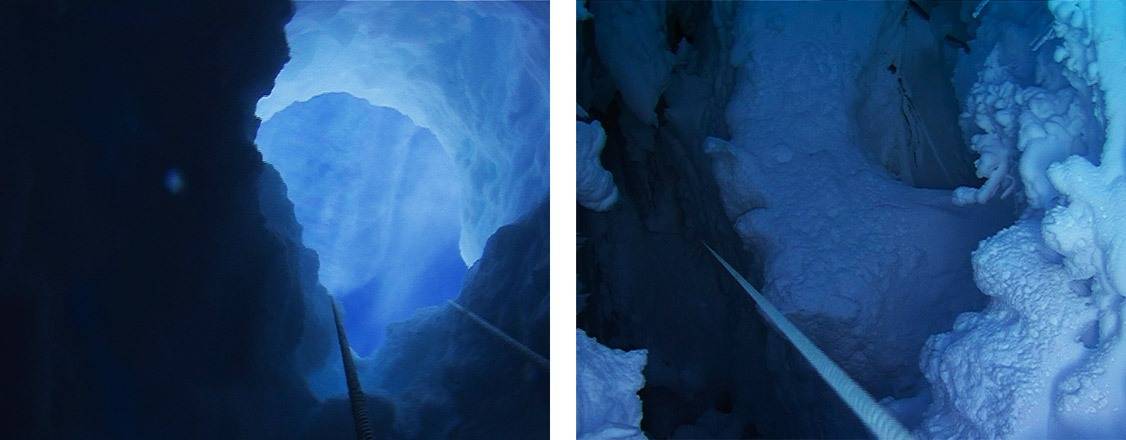 Crevasse is a two-channel video installation depicting a gradual ascent out of an Antarctic crevasse. The ascent, captured simultaneously on two cameras (one downward facing and one upward facing), is replayed in the gallery space – the footage from the downward facing camera is projected onto the floor while the footage from the upward facing camera is projected onto the ceiling.