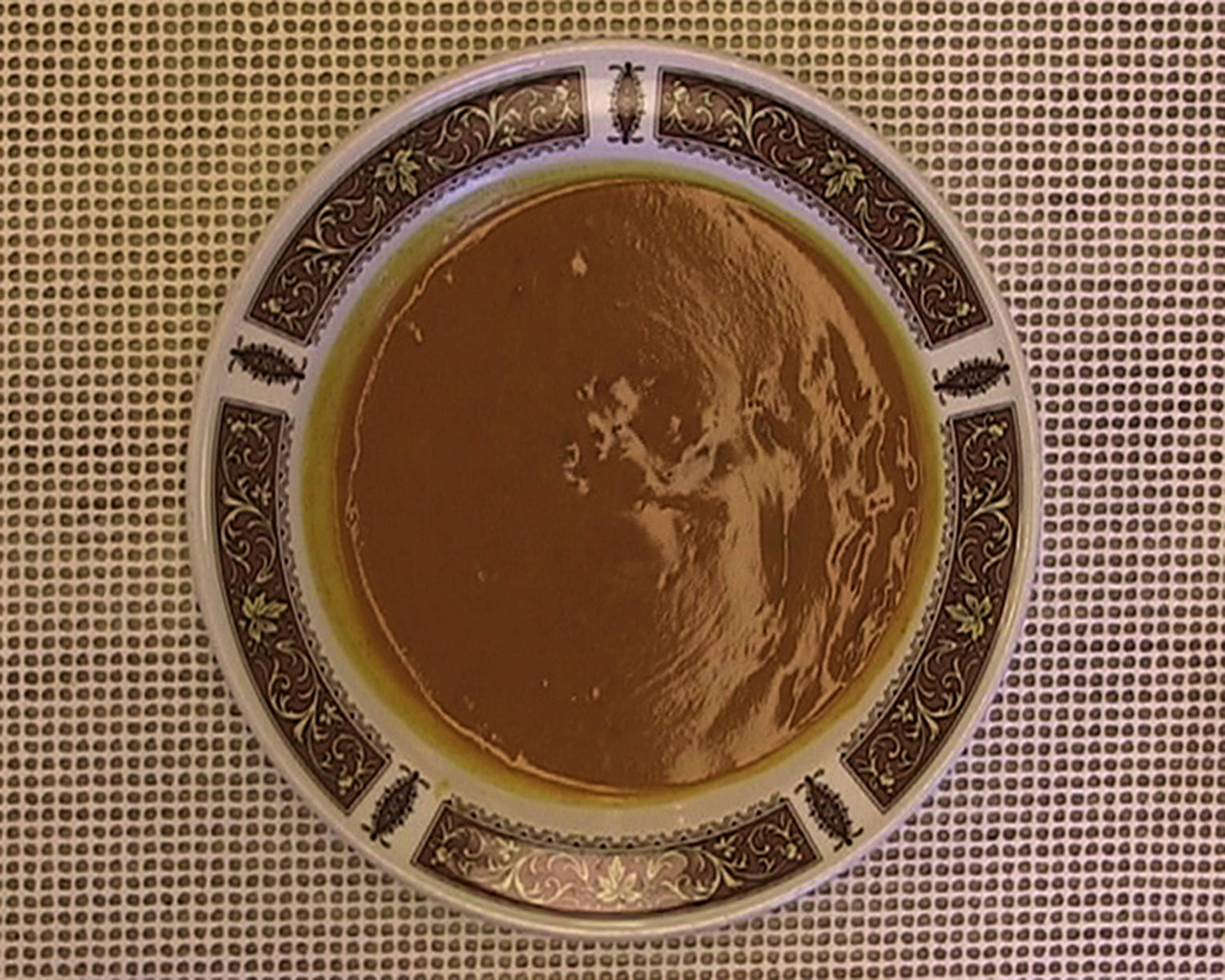 Soup depicts a bowl of tomato soup served to the artist and the ship's crew during a storm. While the bowl itself is kept in position by the friction of a rubberized table mat, the sloshing orange liquid inside is less easily restricted, mirroring the movement of the rough seas outside.