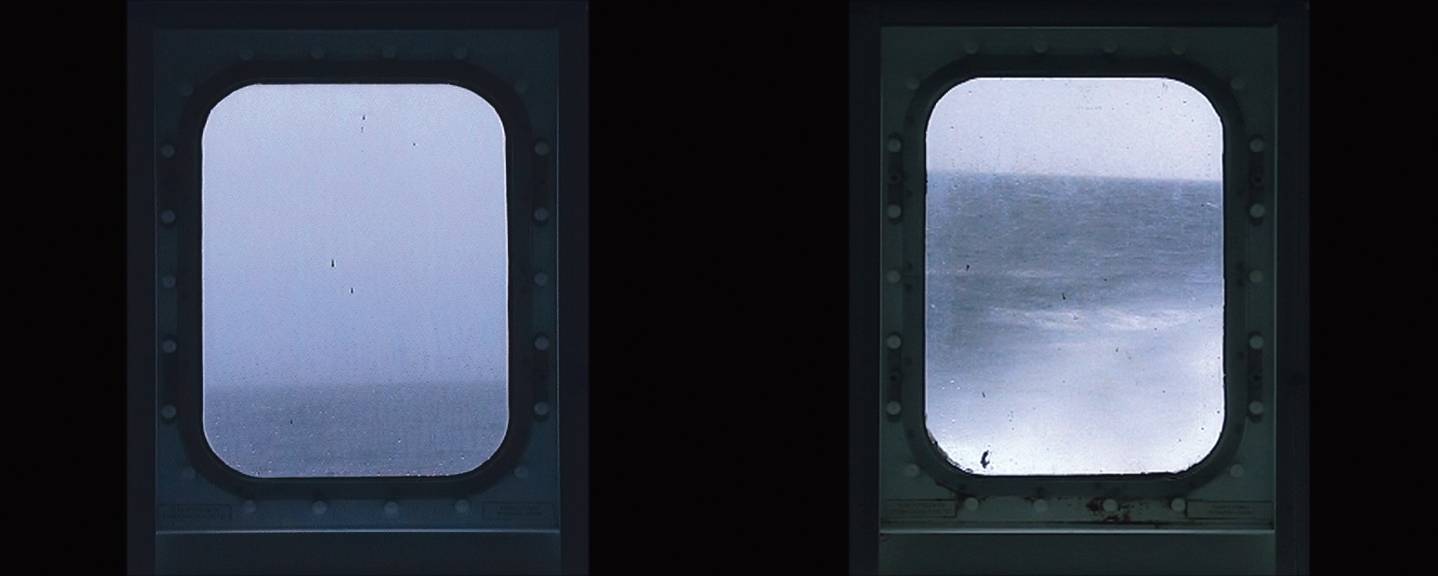 Horizon (Port, Starboard) is a two-channel video projection depicting the moving horizon line filmed simultaneously from opposite sides of an ice-strengthened ship. As the ship propels forward and rolls from port to starboard the horizon rises and falls within the two window frames – one horizon falling exactly as the other rises.